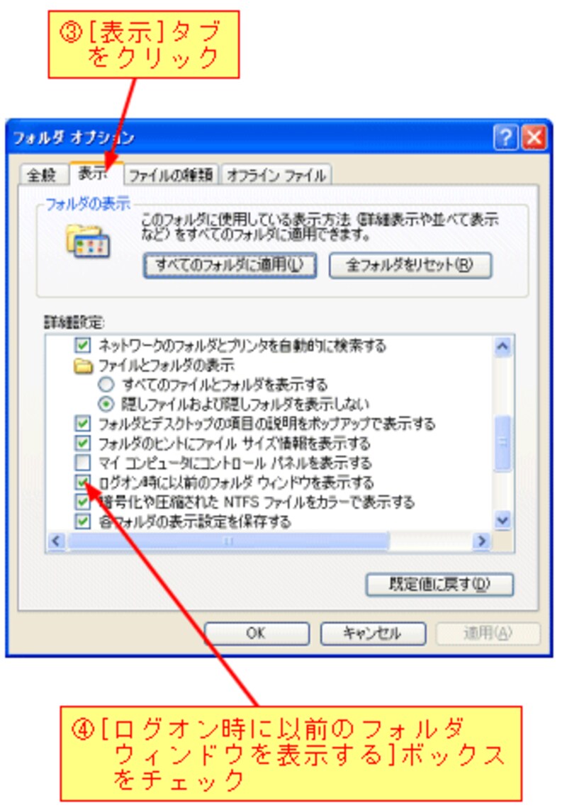 [フォルダオプション]をクリックすると、次のダイアログボックスが表示されます。ここで、[表示]タブにある[ログオン時に以前のフォルダウィンドウを表示する]ボックスをチェックしてから、[OK]ボタンをクリックします。