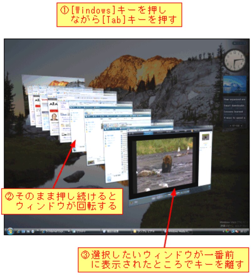 Vistaで、[Alt]キーを押しながら[Tab]キーを押すと、開いているウィンドウのサムネイルが表示される。[Alt]キーを押したままで[Tab]キーを押したり離したりすると、その度にウィンドウが選択される。