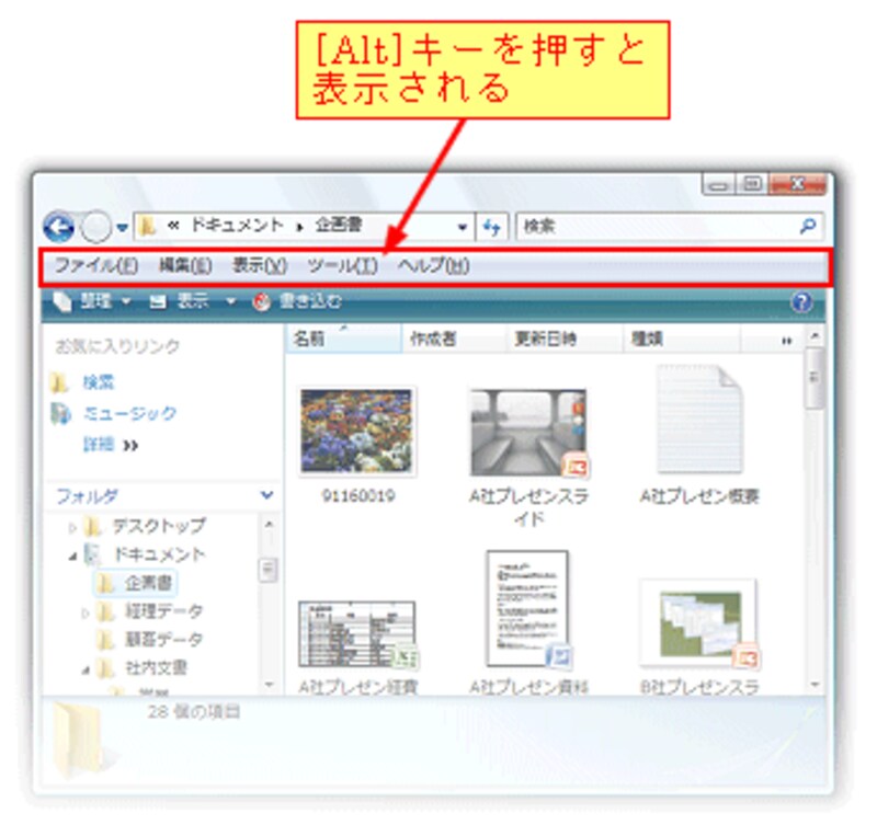 メニューバーは標準設定では隠れているが、[Alt]キーを押すと表示される。常に表示させたい場合は、コマンドバーにある[整理]→[レイアウト]→[メニューバー]をチェックする。