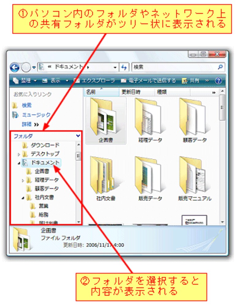 [フォルダ]には、パソコン内のフォルダやネットワーク上の共有フォルダがツリー状に表示される。フォルダを選択すると、右側のペインに内容が表示される。