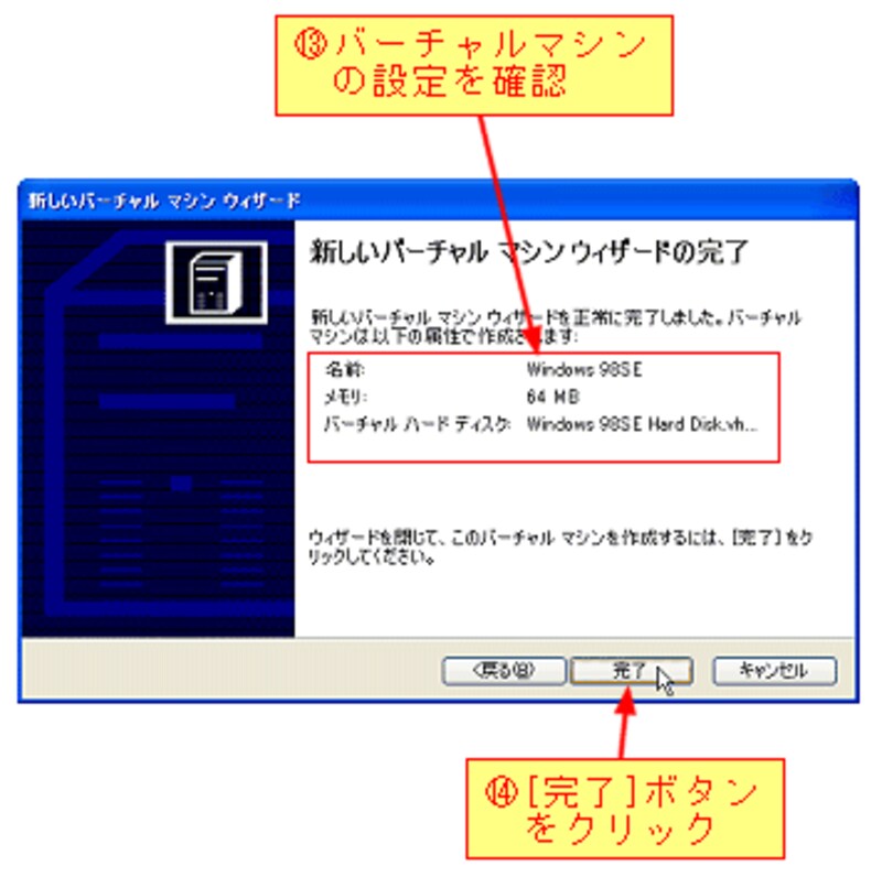最後にバーチャルマシンの設定を確認し、[完了]ボタンをクリックする。