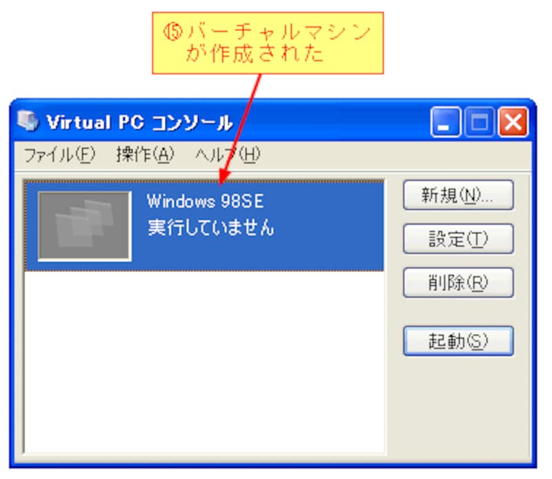 [完了]ボタンをクリックすると、Virtual PCコンソールにバーチャルマシンが作成されたことが分かる。