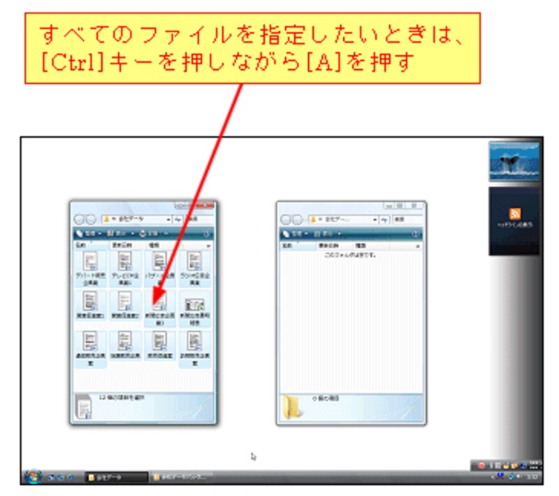 すべてのファイルを指定したいときは、[Ctrl]キーを押しながら[A]を押すか、[表示]メニュー→[すべて選択]をクリックします。