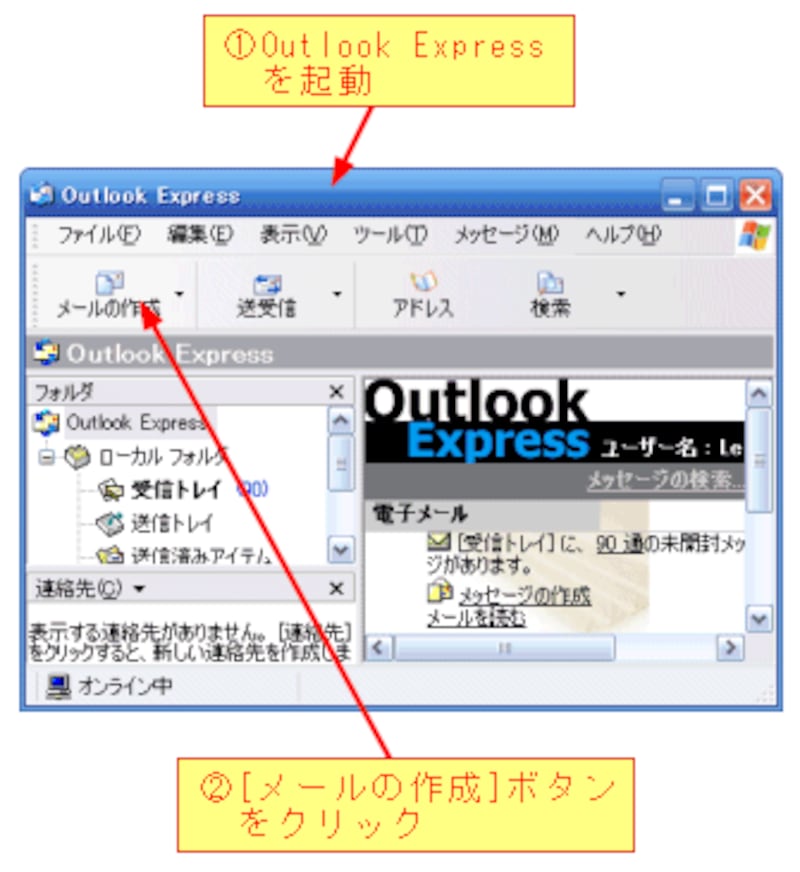 まず、Outlook Expressを起動し、[メールの作成]ボタンをクリックします。