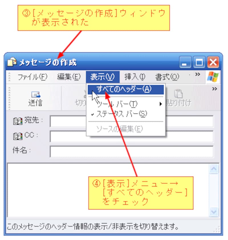 [メールの作成]ボタンをクリックすると、[メッセージの作成]ウィンドウが表示されますので、[表示]メニュー→[すべてのヘッダー]をチェックします。