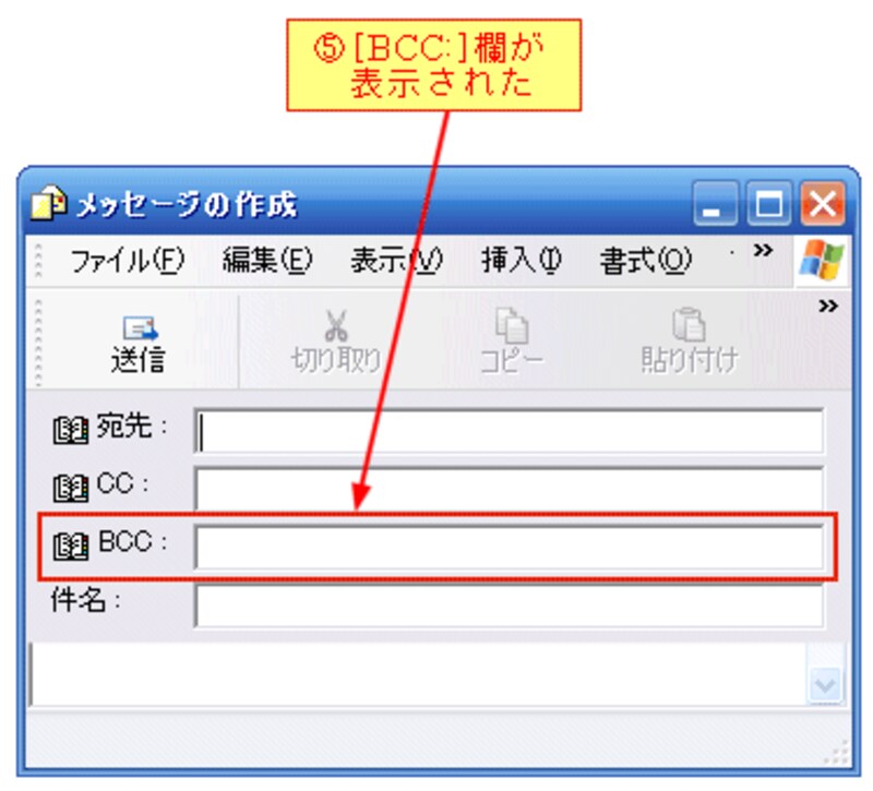 (VistaではWindowsメール)の標準設定では、[BCC:]欄が表示されていません。以下の設定をすると、[BCC:]欄を表示できます。
