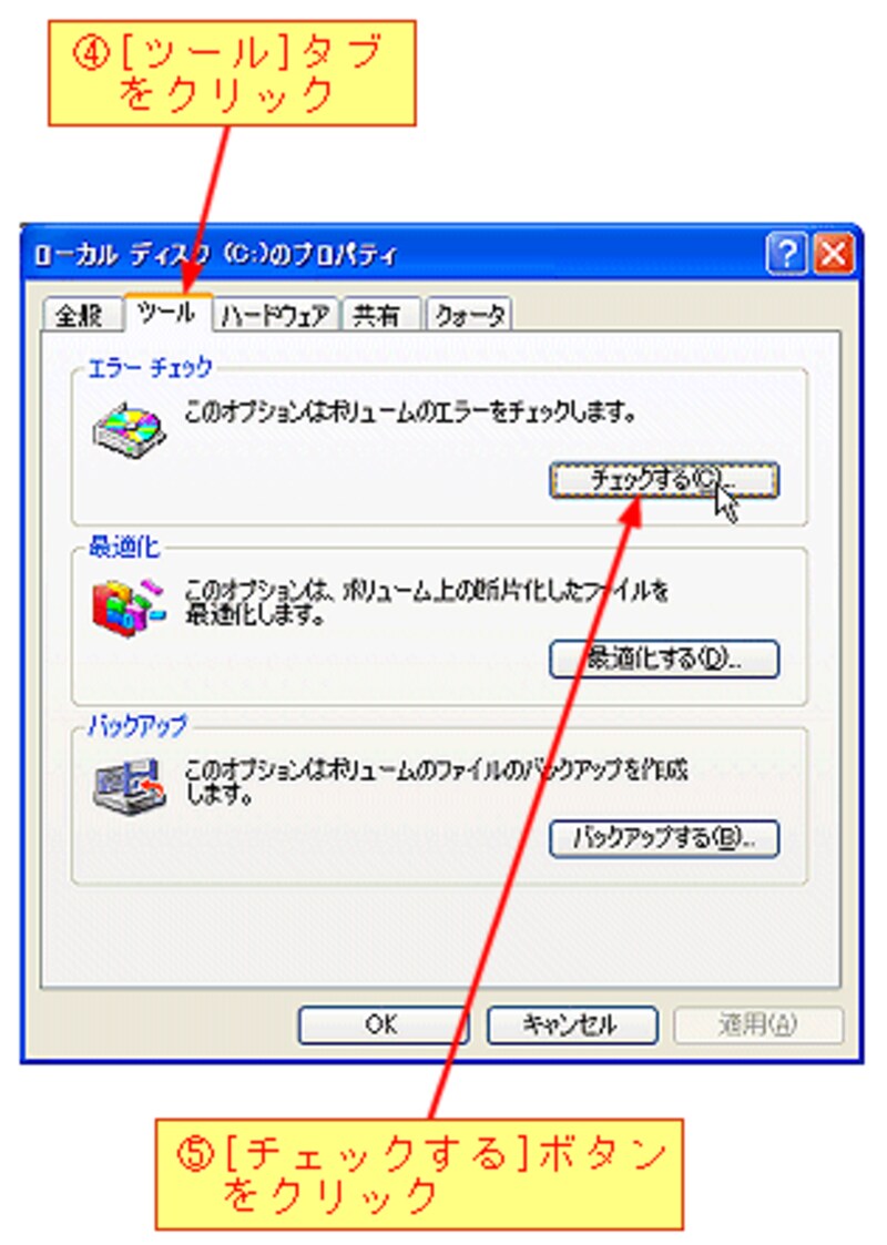 ハードディスクのトラブルを避けるためは、次の操作を定期的に行いエラーの有無を確認してください。