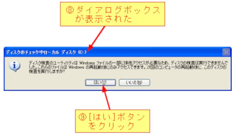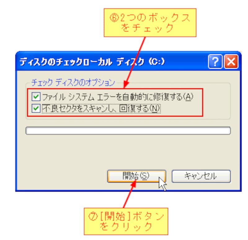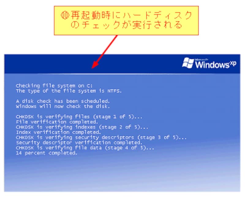 [ファイルシステムエラーを自動的に修復する]ボックスをチェックした場合は、再起動時にハードディスクがチェックが実行されます。