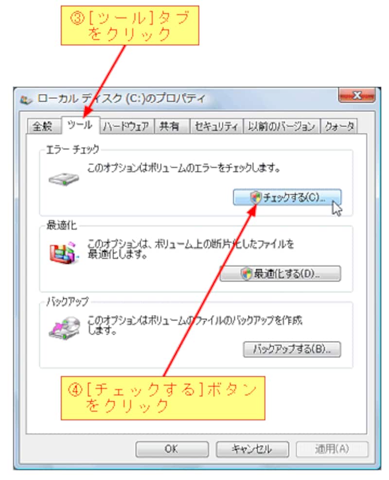[プロパティ]ボタンをクリックすると、次のダイアログボックスが表示されますので、[ツール]タブをクリックし、[チェックする]ボタンをクリックします。
