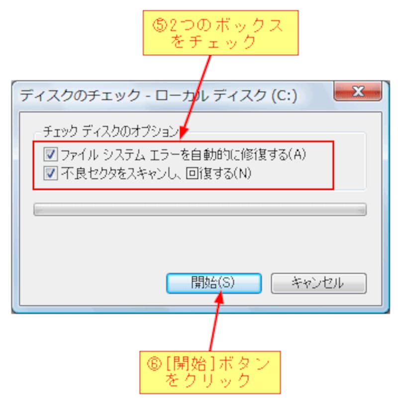 [続行]ボタンをクリックすると、次のダイアログボックスが表示されます。[ファイルシステムエラーを自動的に修復する]ボックスと[不良セクタをスキャンし、回復する]ボックスをチェックして、[開始]ボタンをクリックします。