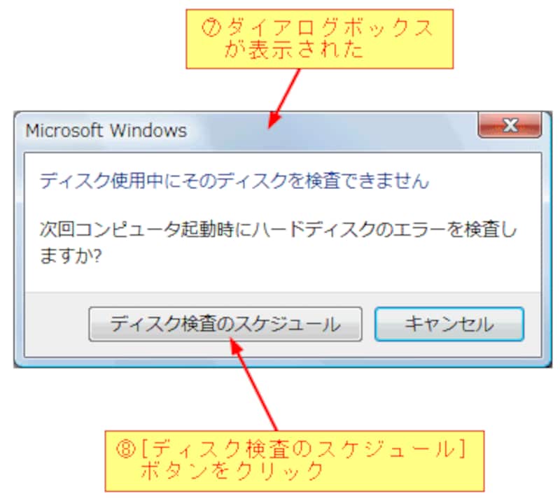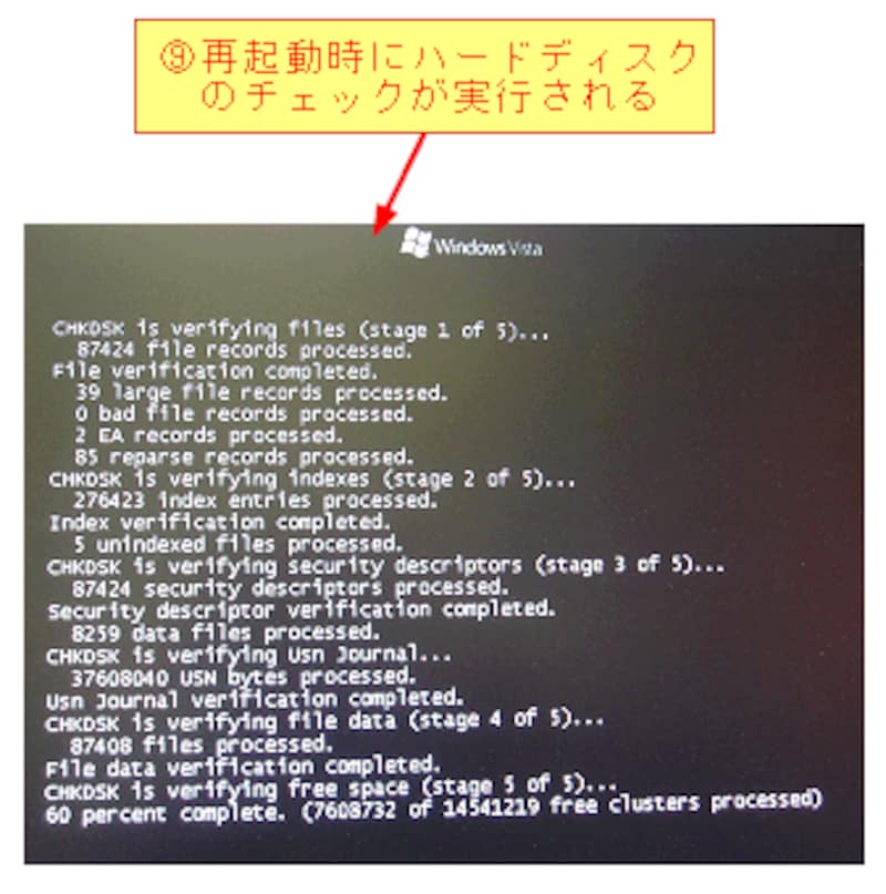 Windows Vistaでは、ハードディスクのチェックにかなり時間がかかります。昼休みなどを利用して実行すると良いでしょう。