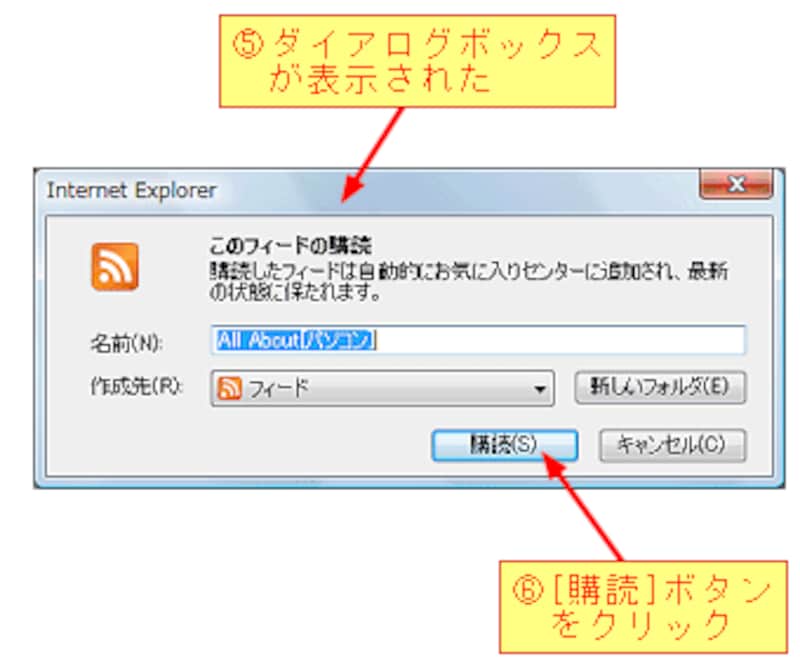 [このフィードを購読する]ボタンをクリックすると、次のダイアログボックスが表示されますので、内容を確認してから[購読]ボタンをクリックします。
