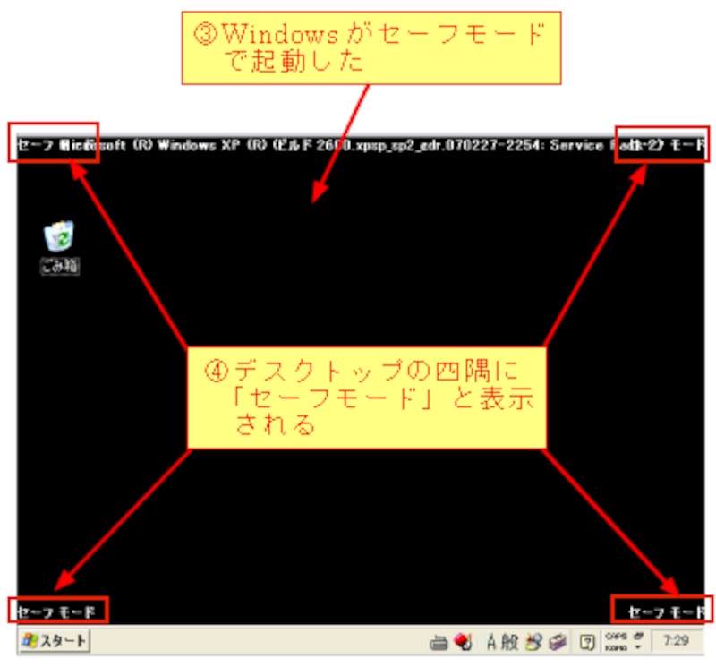 セーフモードで起動しているときはデスクトップの四隅に「セーフモード」と表示されます。
