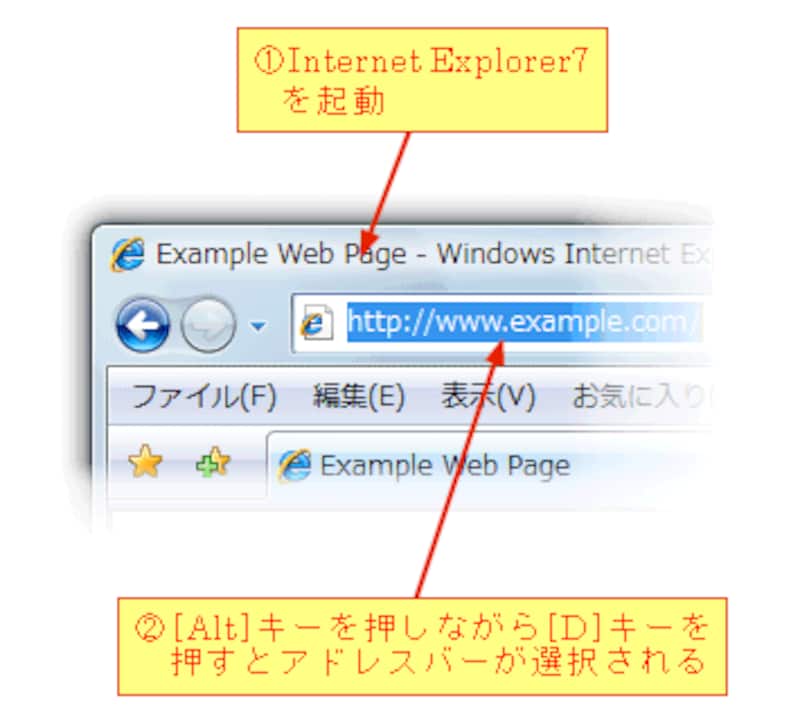 まず、Internet Explorer7を起動します。続いて、[Alt]キーを押しながら[D]キーを押すとアドレスバーが選択されます。