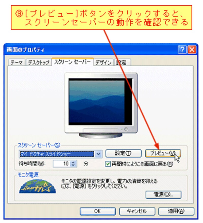 [プレビュー]ボタンをクリックすると、スクリーンセーバーの動作を確認できます。