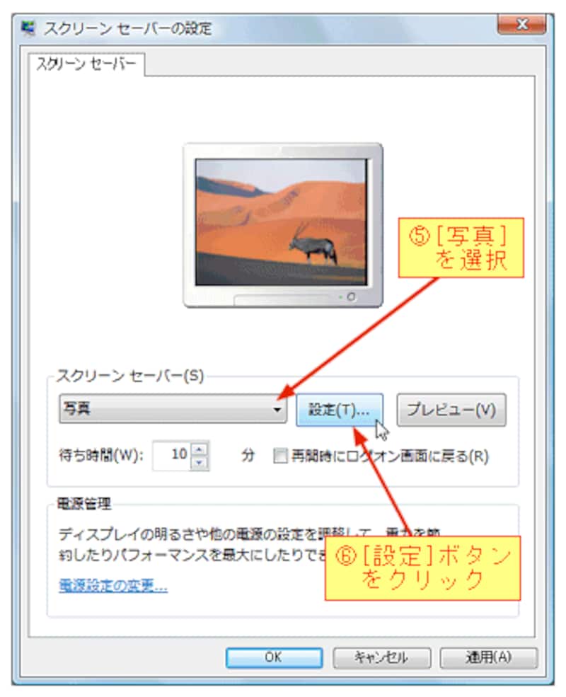 続いて、[スクリーンセーバー]リストから[写真]を選択し、[設定]ボタンをクリックします。