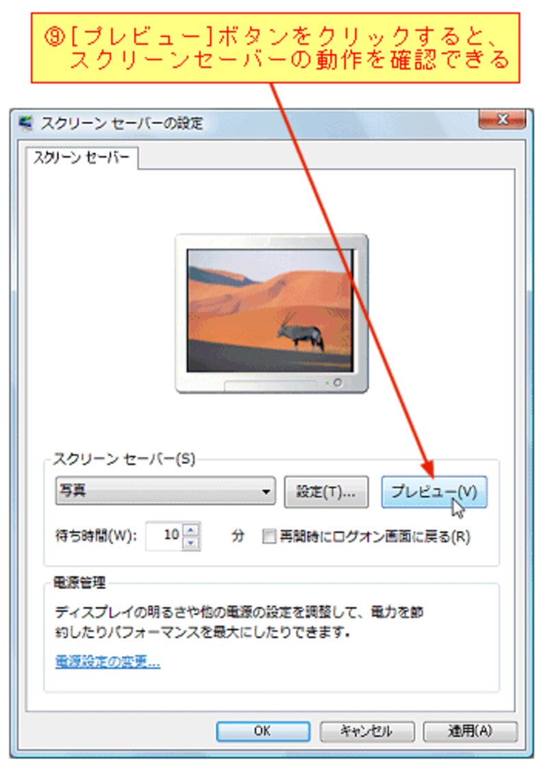 [プレビュー]ボタンをクリックすると、スクリーンセーバーの動作を確認できます。