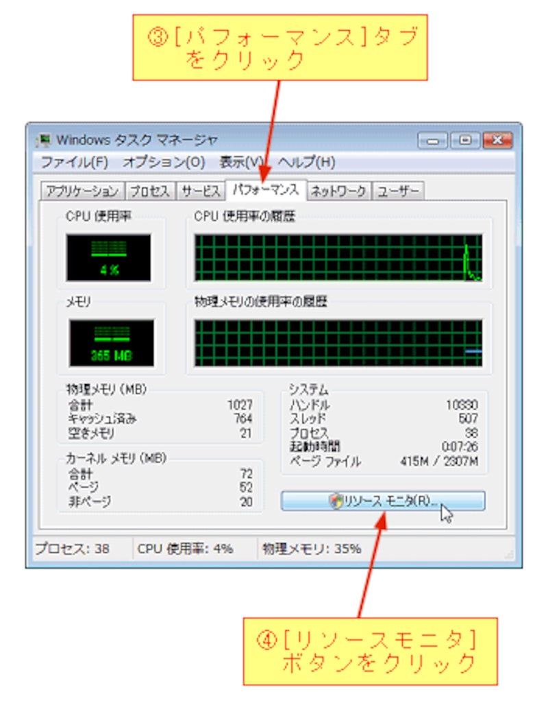 [タスクマネージャ]をクリックすると、次のダイアログボックスが表示されますので、[パフォーマンス]タブにある[リソースモニタ]ボタンをクリックします。