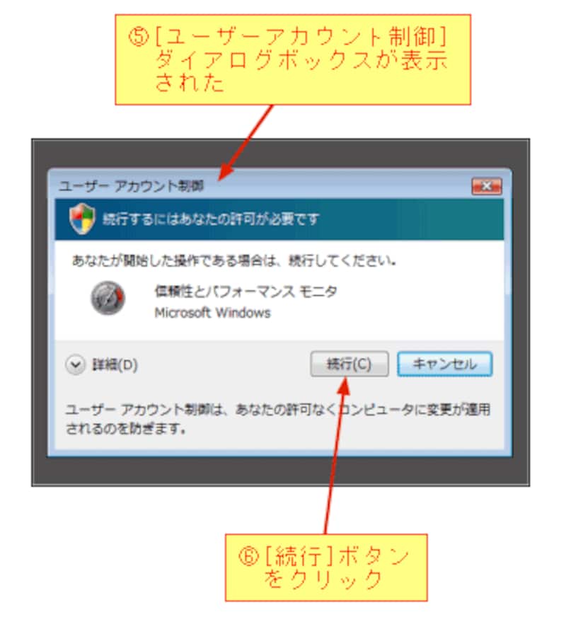 [リソースモニタ]ボタンをクリックすると、[ユーザーアカウント制御]ダイアログボックスが表示されますので、[続行]ボタンをクリックします。
