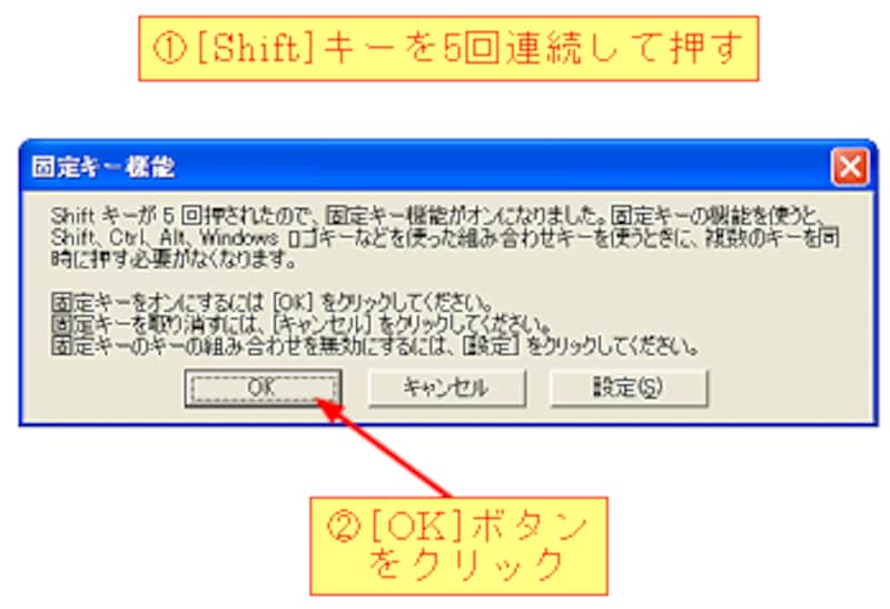 まず、[Shift]キーを5回連続して押します。すると、[固定キー機能]ダイアログボックスが表示されますので、[OK]ボタンをクリックします。