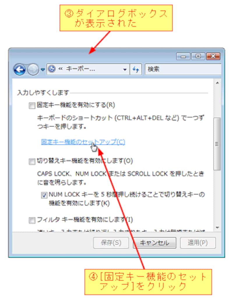 [キーボードの動作の変更]をクリックすると、以下のダイアログボックスが表示されますので、[固定キー機能のセットアップ]をクリックします。