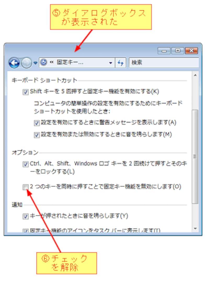 [固定キー機能のセットアップ]をクリックすると、以下のダイアログボックスが表示されますので、[2つのキーを同時に押すことで固定機能を無効にします]ボックスのチェックを解除します。