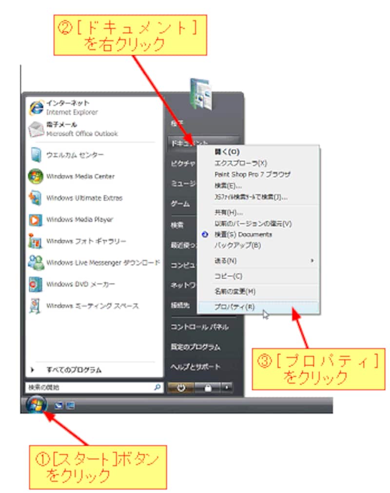 続いて、[スタート]ボタンをクリックし [ドキュメント]を右クリックします。ショートカットメニューが表示されたら、[プロパティ]メニューをクリックします。