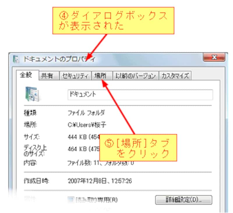 [ドキュメントのプロパティ]ダイアログボックスが表示されたら、[場所]タブをクリックします。