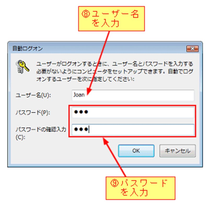 7)[自動ログオン]ダイアログボックスに自動ログオンするユーザー名、