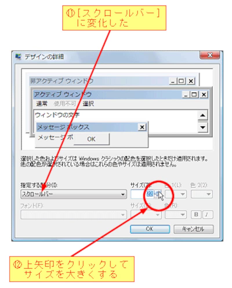 例示されているウィンドウのスクロールバーをクリックすると、[指定する部分]の内容が[スクロールバー]に変化します。[サイズ]欄の右側にある矢印をクリックするとサイズを変更できます。