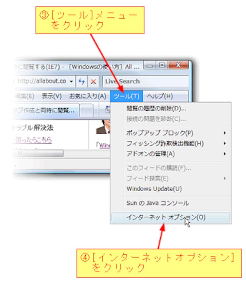 メニューが表示されたら、[ツール]メニュー→[インターネットオプション]をクリックします。