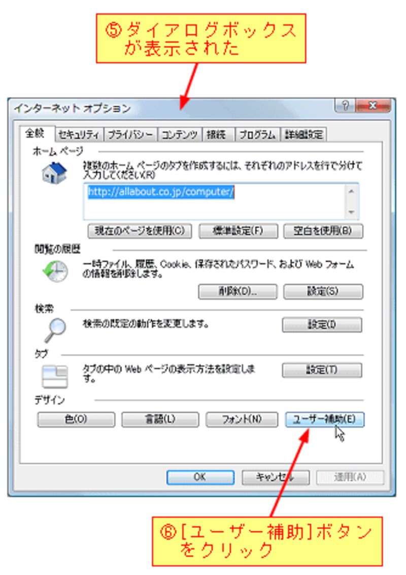 [インターネットオプション]をクリックすると、次のダイアログボックスが表示されますので、[全般]タブの[デザイン]セクションにある[ユーザー補助]ボタンをクリックします。