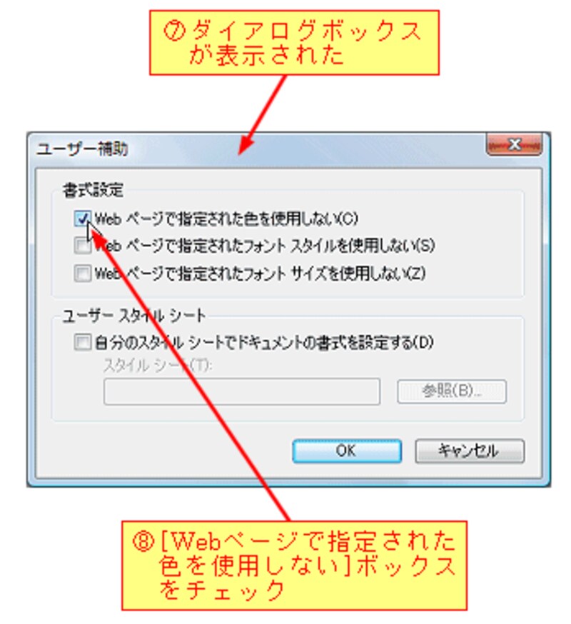 [ユーザー補助]ボタンをクリックすると、[ユーザー補助]ダイアログボックスが表示されますので、[Webページで指定された色を使用しない]ボックスをチェックします。