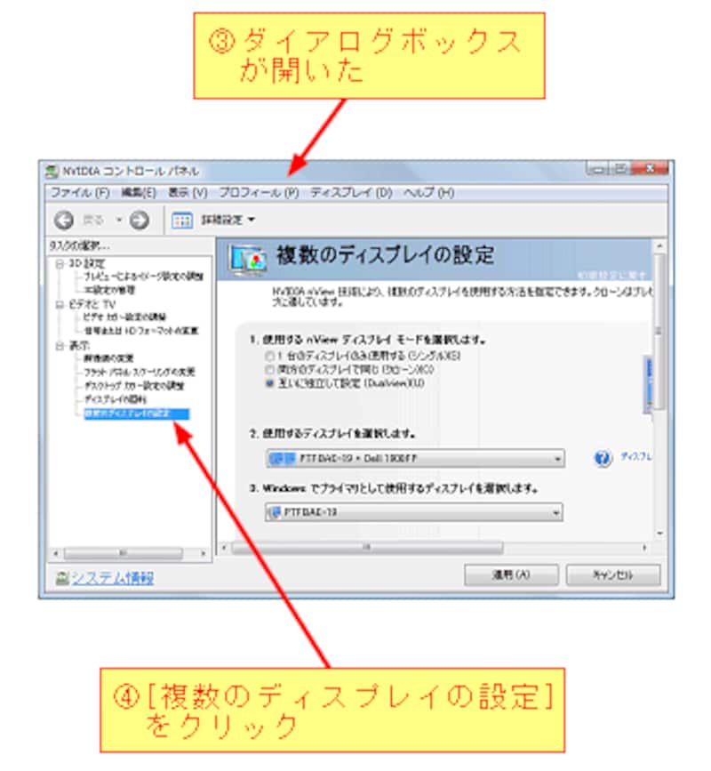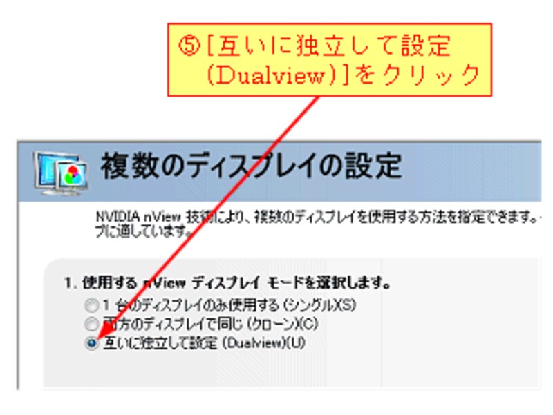 [表示]→[複数のディスプレイの設定]をクリックすると、以下のダイアログボックスが表示されるので、ディスプレイモードを[互いに独立して設定(Dualview)]をクリックする。