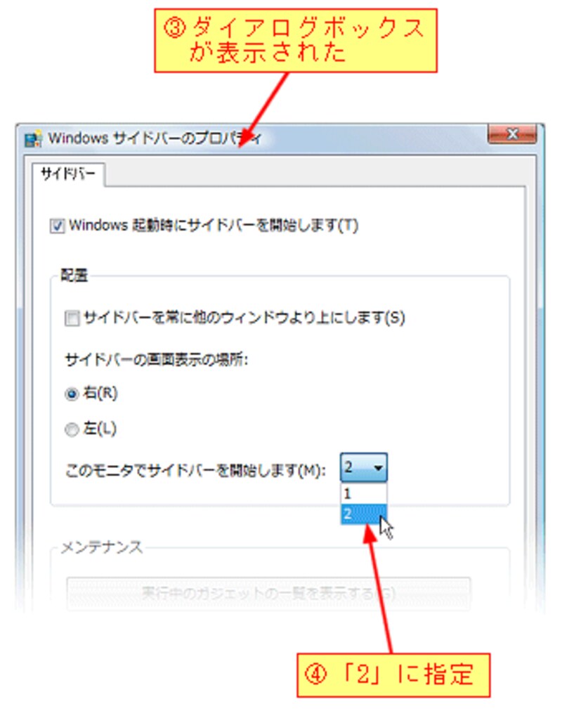 [プロパティ]をクリックすると、以下のダイアログボックスが表示されるので、[このモニタでサイドバーを開始します]を「2」に指定する。