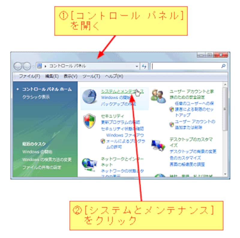まず、[コントロール パネル]を開きます。[コントロール パネル]がカテゴリ表示に設定されている場合は、[システムとメンテナンス]をクリックします。