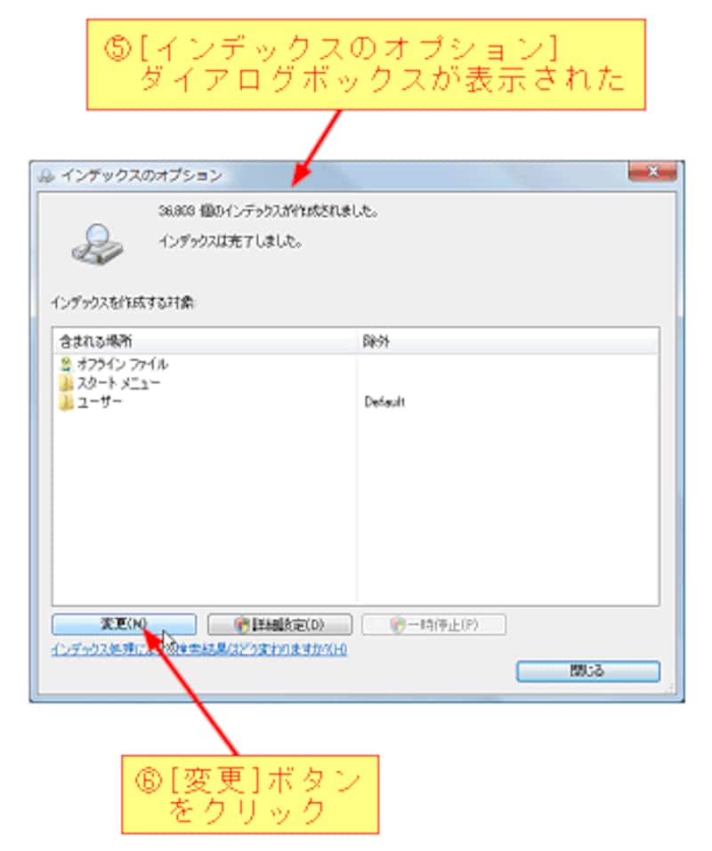 [インデックスのオプション]をクリックすると、[インデックスのオプション]ダイアログボックスが表示されますので、[変更]ボタンをクリックします。