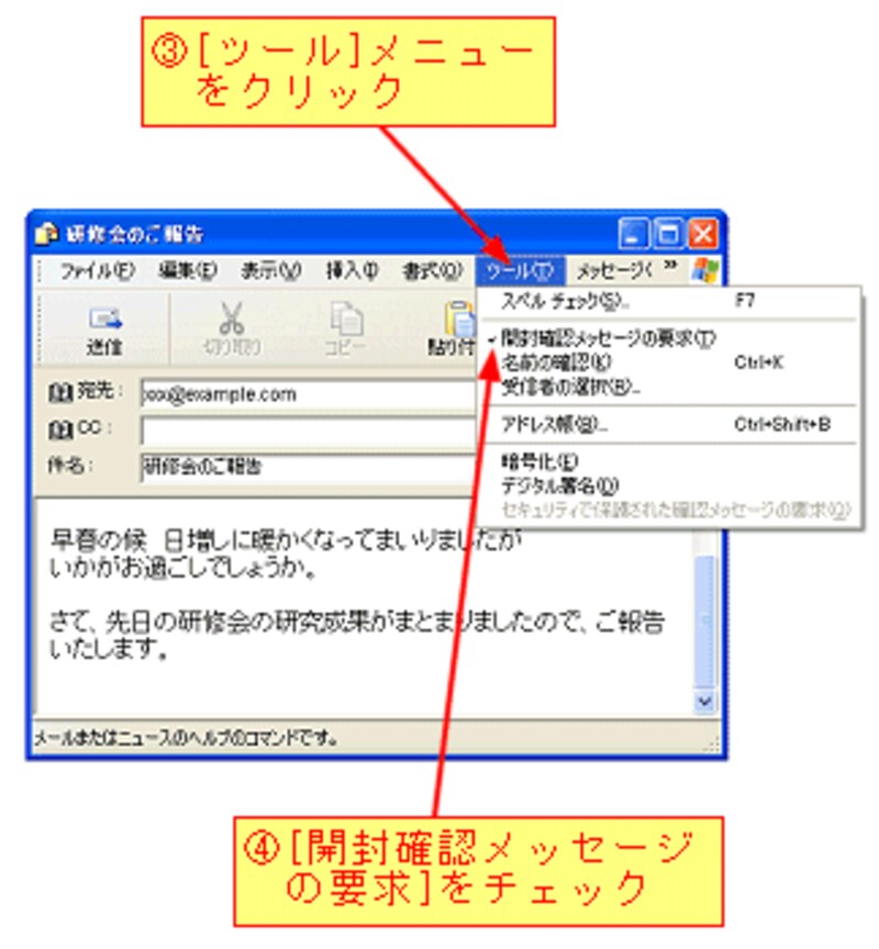 メッセージが完成したら、[ツール]メニューをクリックし、[開封確認メッセージの要求]をチェックします。