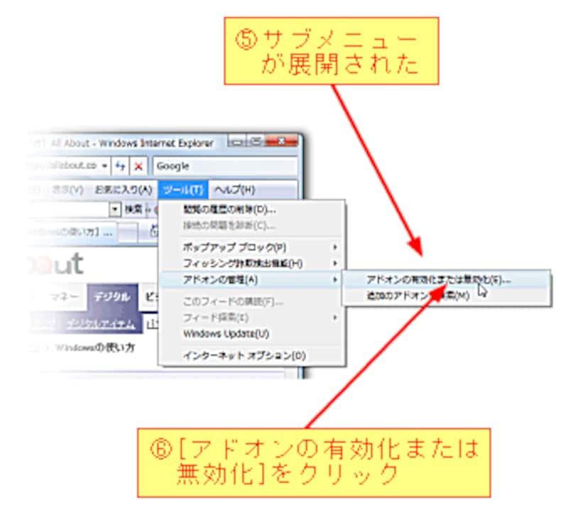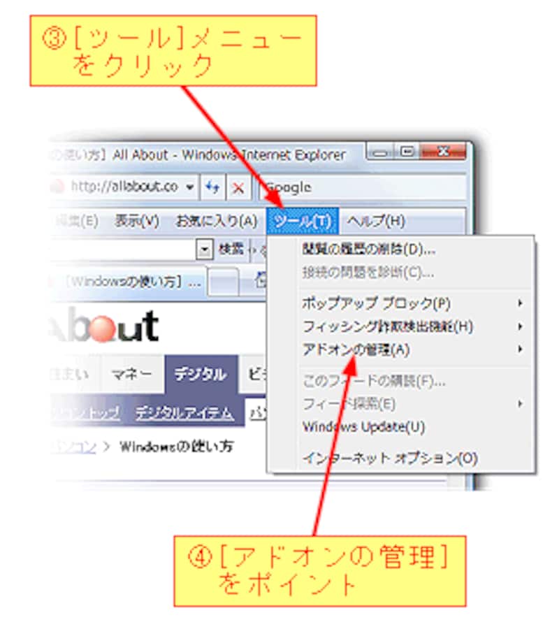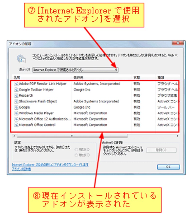 Internet Explorer7には、動画表示やファイルアップロードなどの機能を追加するために、いろいろなアドオンがインストールされています。