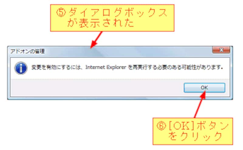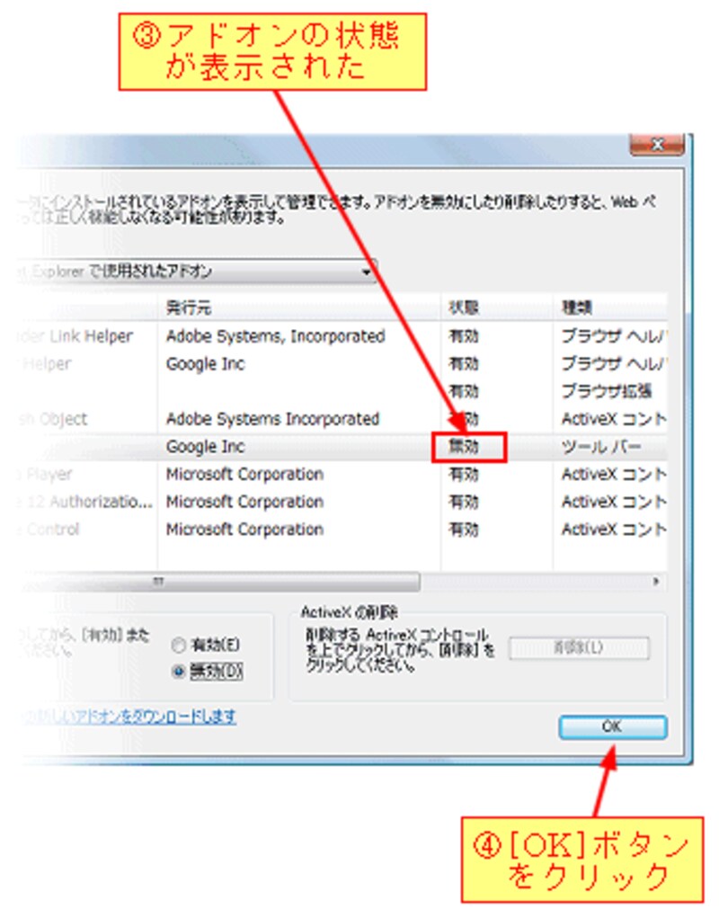[無効]ボタンをクリックすると、アドオンの状態が表示されますので[OK]ボタンをクリックします。