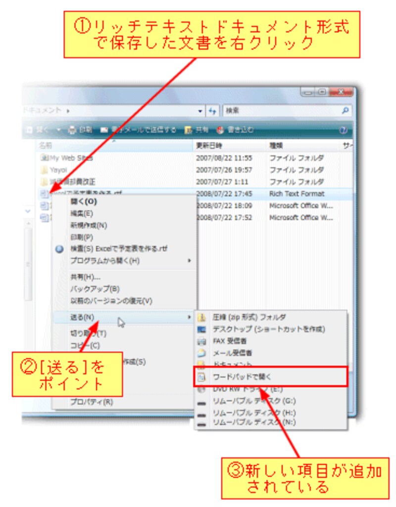 以上で設定が完了しました。試しにリッチテキスト ドキュメント形式で保存した文書を右クリックしてみましょう。ショートカットメニューが表示されますので、[送る]をポイントすると、[ワードパッドで開く]という項目が追加されているのを確認できます。