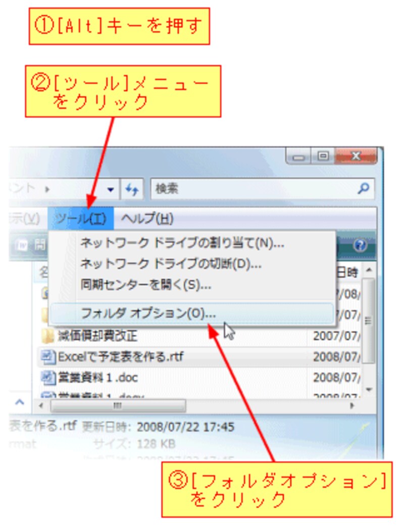 次の操作で設定を変更すると確認できます。まず、[Alt]キーを押してメニューバーを表示させて、[ツール]メニュー→[フォルダオプション]をクリックします。