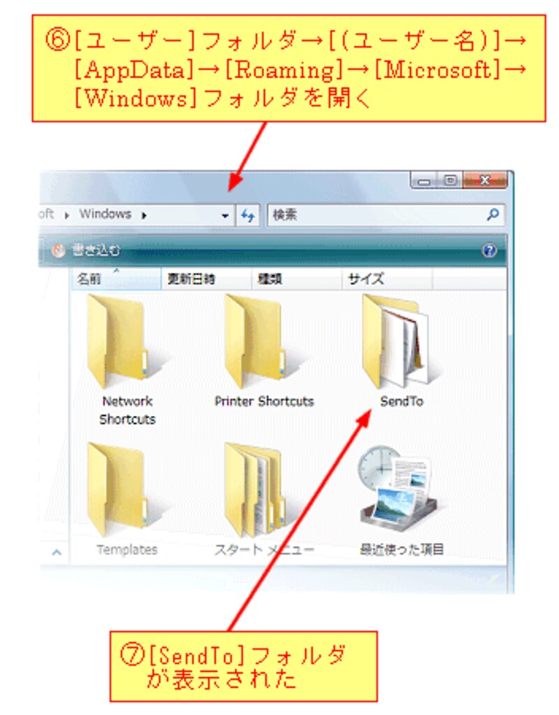 設定を変更すると、[ユーザー]フォルダ→[(ログオンしたユーザー名)]→[AppData]→[Roaming]→[Microsoft]→[Windows]フォルダ内に[SendTo]フォルダが表示されます。
