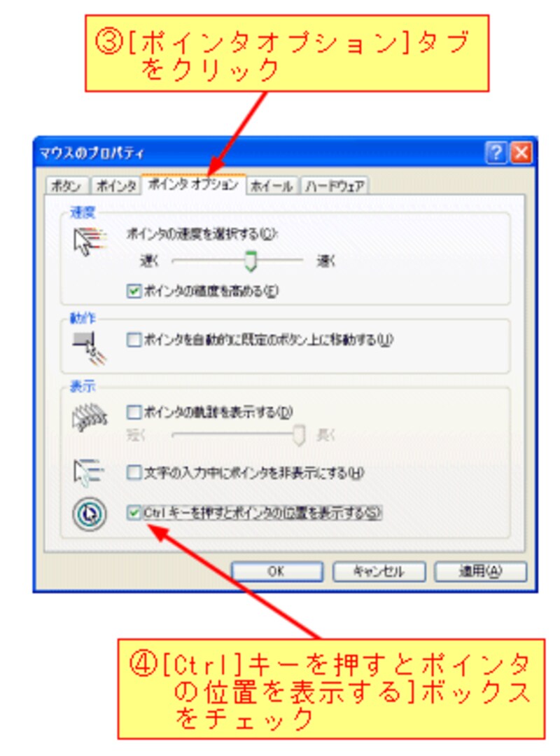 以下の設定をすると、[Ctrl]キーがマウスポインタの位置を教えてくれます。なお、以下の解説はWindows XPでの操作です。Windows