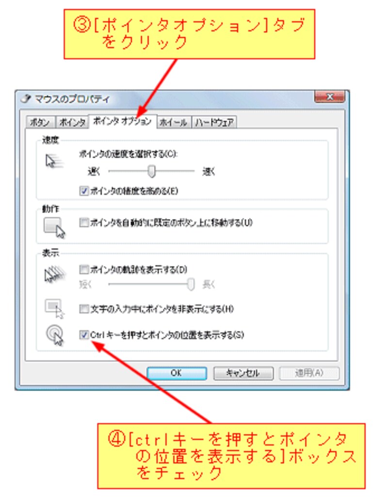 [マウス]をクリックすると、[マウスのプロパティ]ダイアログボックスが表示されます。[ポインタオプション]タブをクリックし、[Ctrl キー を押すとポインタの位置を表示する]ボックスをチェックします。