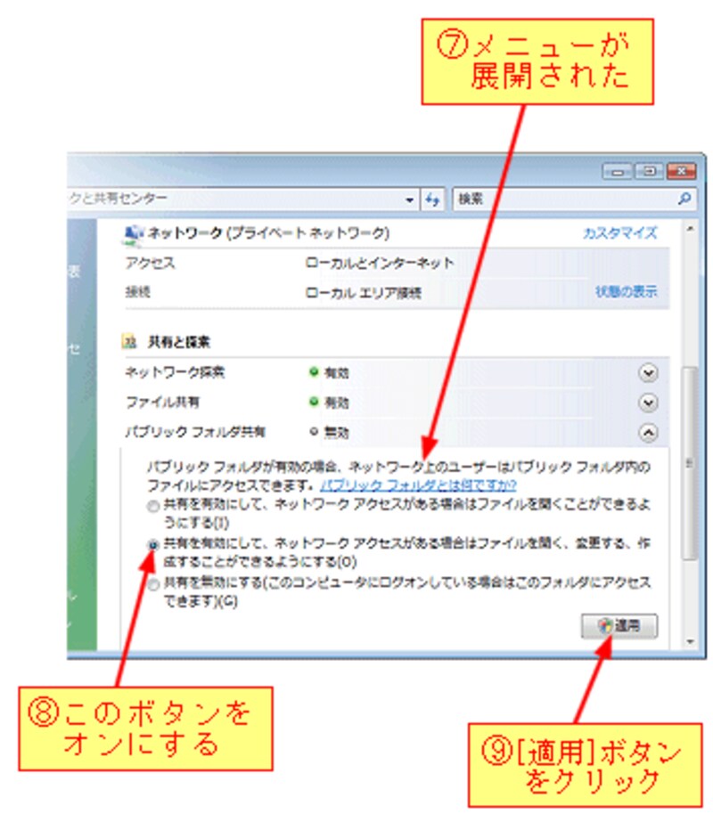 [プロパティ]をクリックすると、[ネットワークと共有センター]ダイアログボックスが表示されますので、[パブリックフォルダ共有]の右側にあるボタンをクリックします。