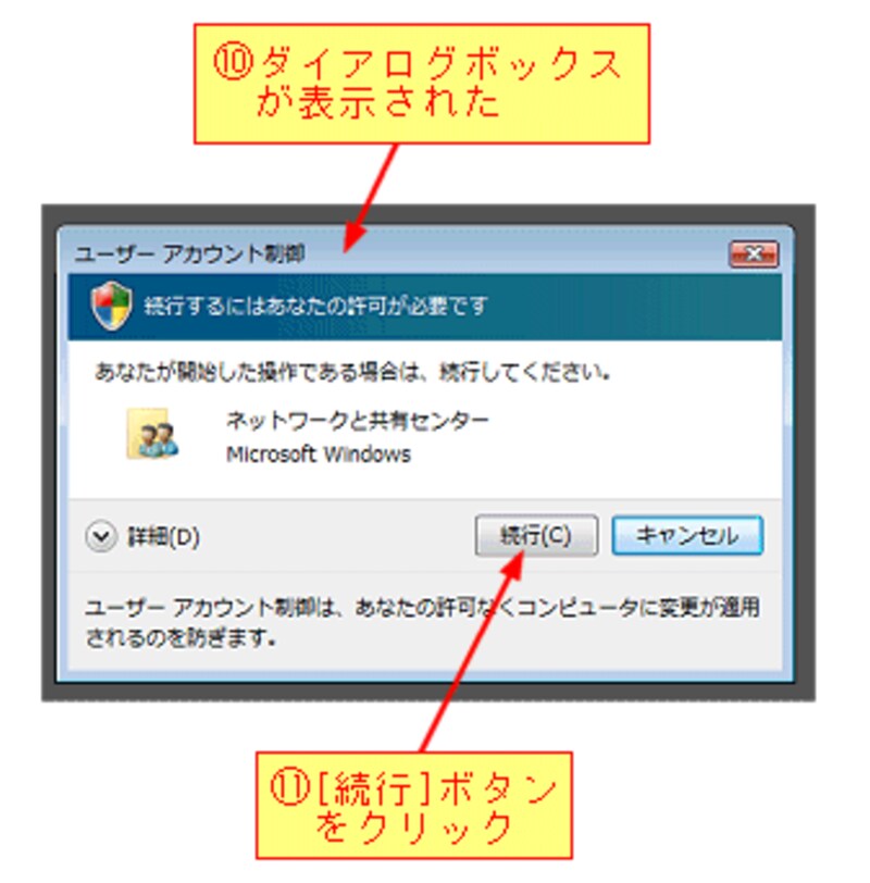 [適用]ボタンをクリックと[ユーザーアカウント制御]ダイアログボックスが表示されますので、[続行]ボタンをクリックします。