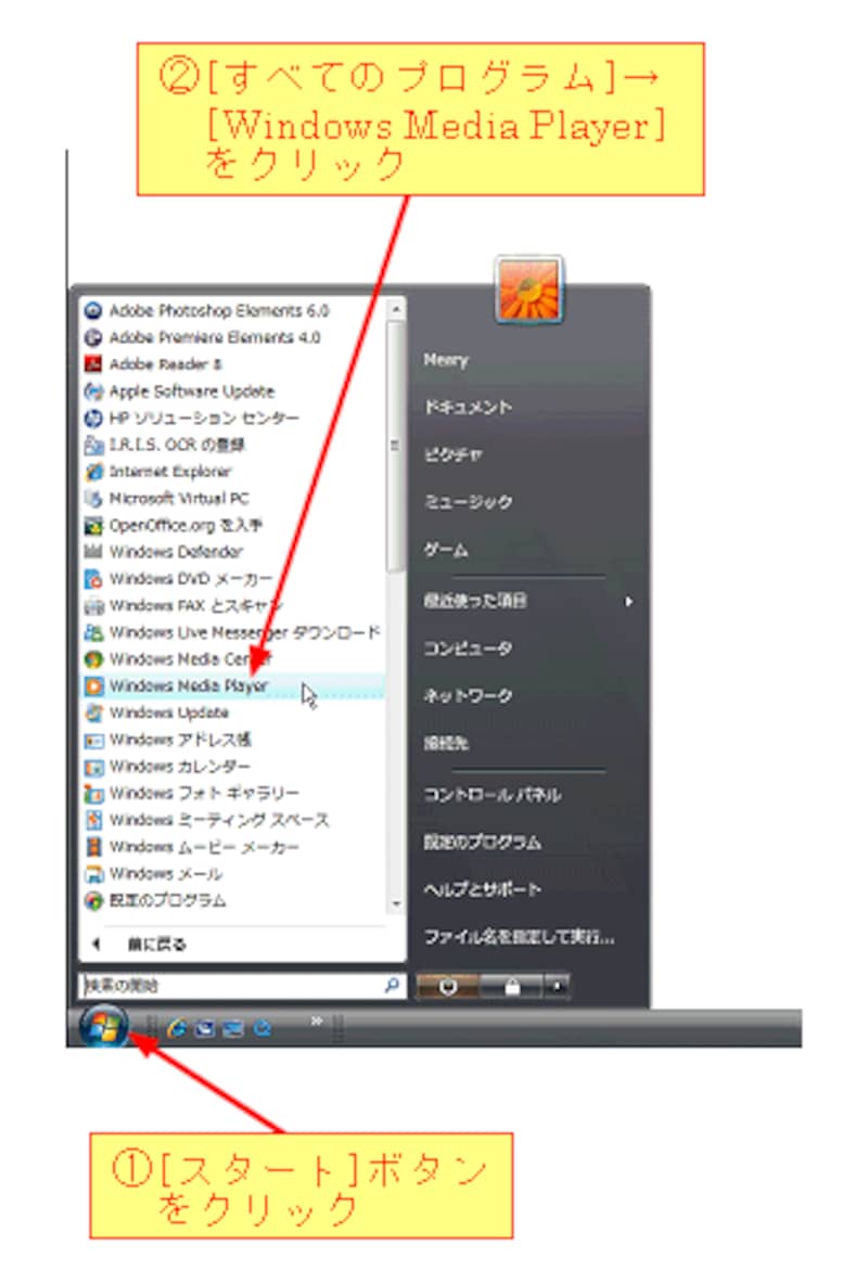 Windows Media Player11 を起動するには、[スタート]ボタンをクリックし、[すべてのプログラム]→[Windows Media Player]をクリックします。