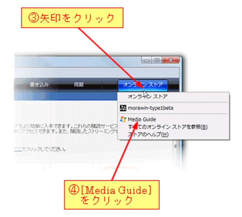 Windows Media Player11が起動したら、[オンラインストア]タブの下にある矢印をクリックし、[Media Guide]をクリックします。