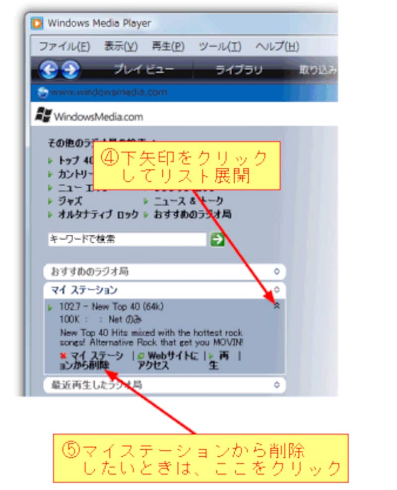 マイステーションから削除したいときは、下矢印をクリックしてリスト展開してから[マイステーションから削除]をクリックします。